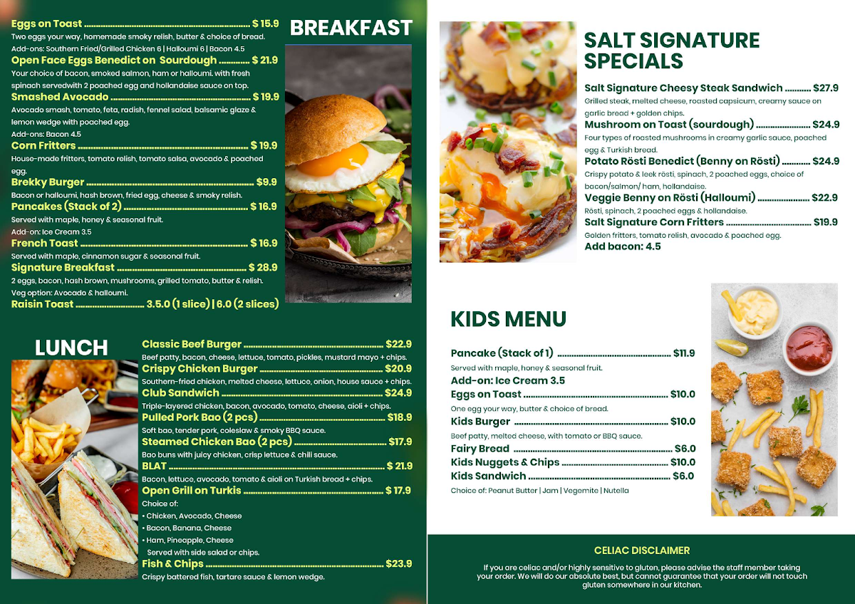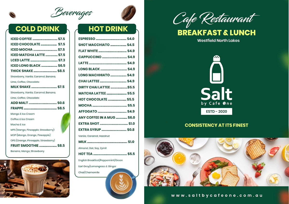 Salt by Cafe One, nestled in Westfield North Lakes, offers a vibrant menu that perfectly balances quality and variety. Their coffee selection shines with expertly crafted iced and hot beverages, including rich iced mocha, smooth matcha latte, and robust long black, catering to all taste preferences. The burger lineup stands out, especially the Classic Beef Burger with its juicy patty and bacon, and the Southern-fried Crispy Chicken Burger, both served with crispy chips that complement the flavors beautifully.
